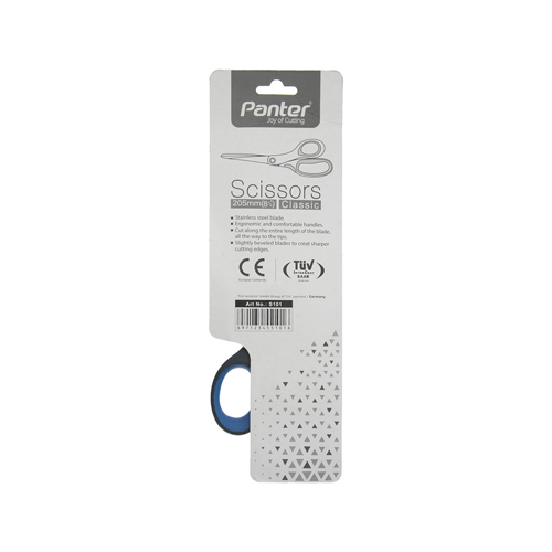 قیچی پنتر مدل S101 سایز 8.5 اینچ یکی از تولیدات برند معتبر پنتر می باشد، این قیچی با نوع برش ساده و تجهیز به تیغه ضد زنگ از جنس استیل به طول 9 سانتی متر است. برای برش انواع کاغذ، عکس و پارچه بسیار ایده آل و کاربردی خواهد بود. همچنین این قیچی 8 اینچی دارای دسته های نرم و ارگونومیک از جنس پلاستیک بوده که کاربر در هنگام استفاده طولانی مدت از قیچی دچار خستگی دست نمی شود. خرید قیچی پنتر مدل S102 در رنگبندی های متنوع مشکی، آبی، مشکی مات و قرمز تولید و به بازار عرضه می گردد.